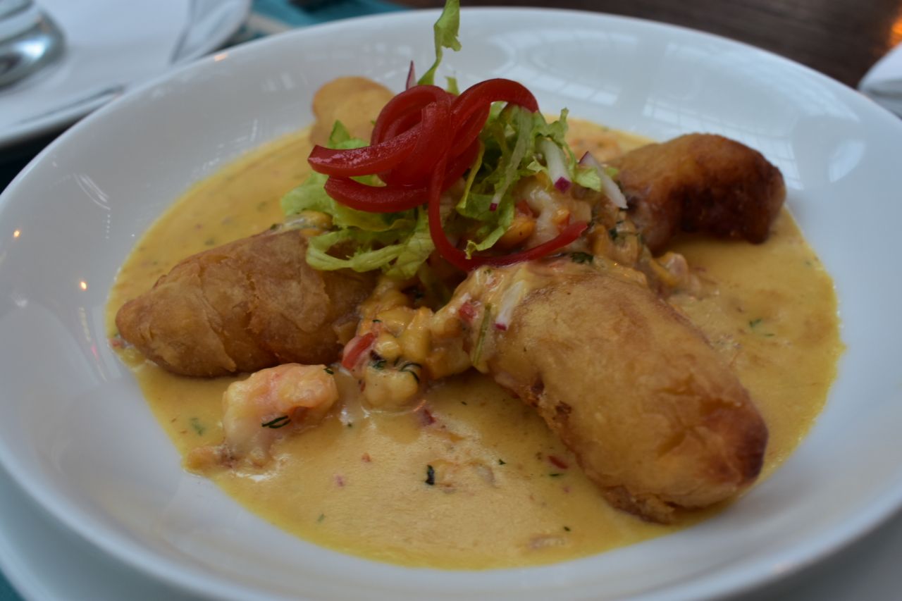 For your main course, the baked Corvina y Langostinos ($35,8000) is truly a stunning choice. The sea bass, was flaky, moist and tender. This dish is topped off with a drizzled yellow pepper sauce (ají amarillo), not at all spicy, much to my distress, atop a pureed yuca enhanced with leche de coco, and slices of quartered, grilled tomatoes.